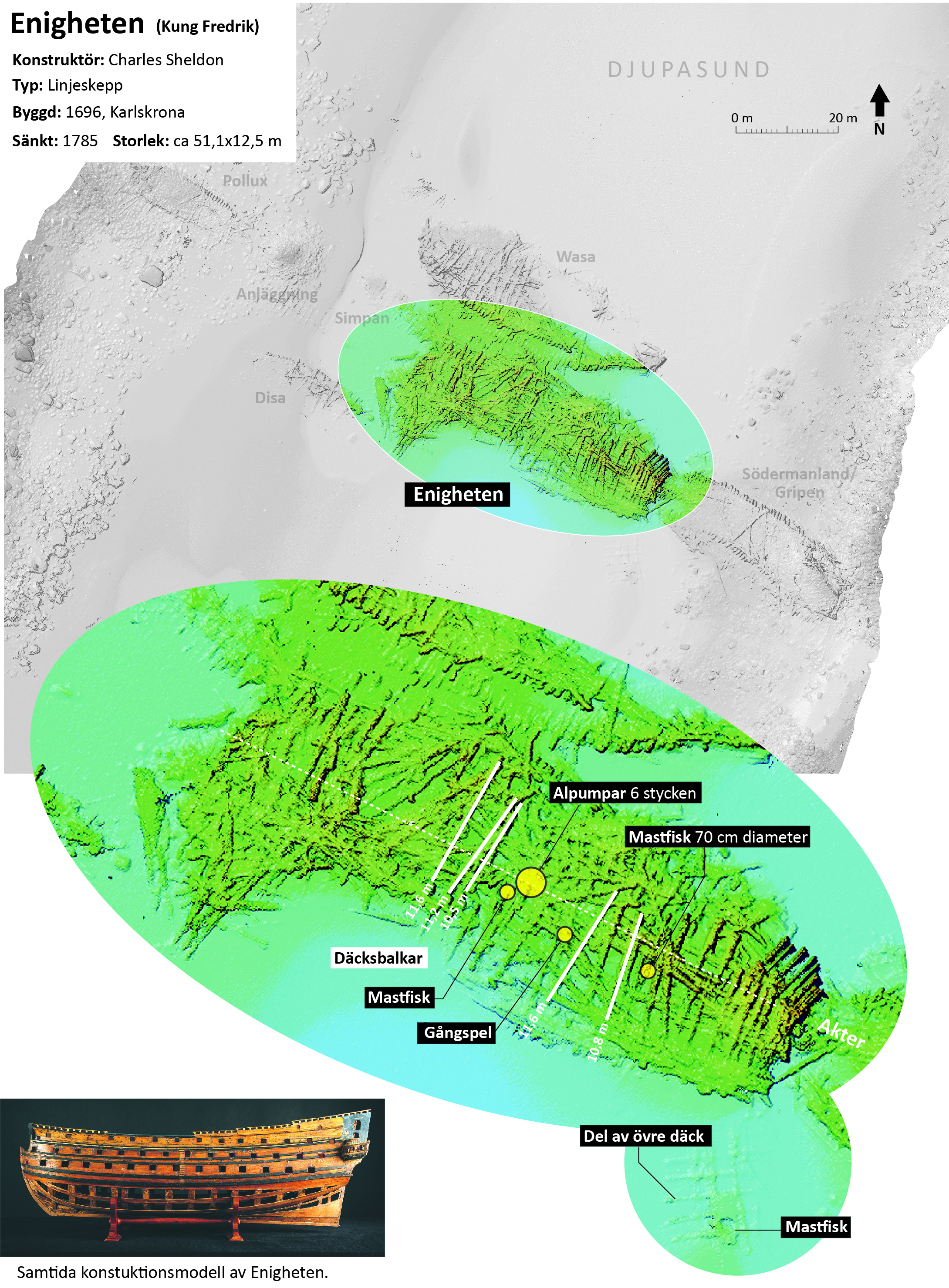 The three-decked ship of the line Enigheten was launched in Karlskrona in 1696 and was one of the biggest ships of its time in the Swedish navy. The ship was just over 51 metres long and 12.5 metres wide, with a crew of more than 700 men. During the Great Northern War, Enigheten was armed with upwards of 90 guns and served in several naval battles. Enigheten was later renamed Konung Fredrik and converted into a two-decker. It was sunk in Djupasund in 1785.