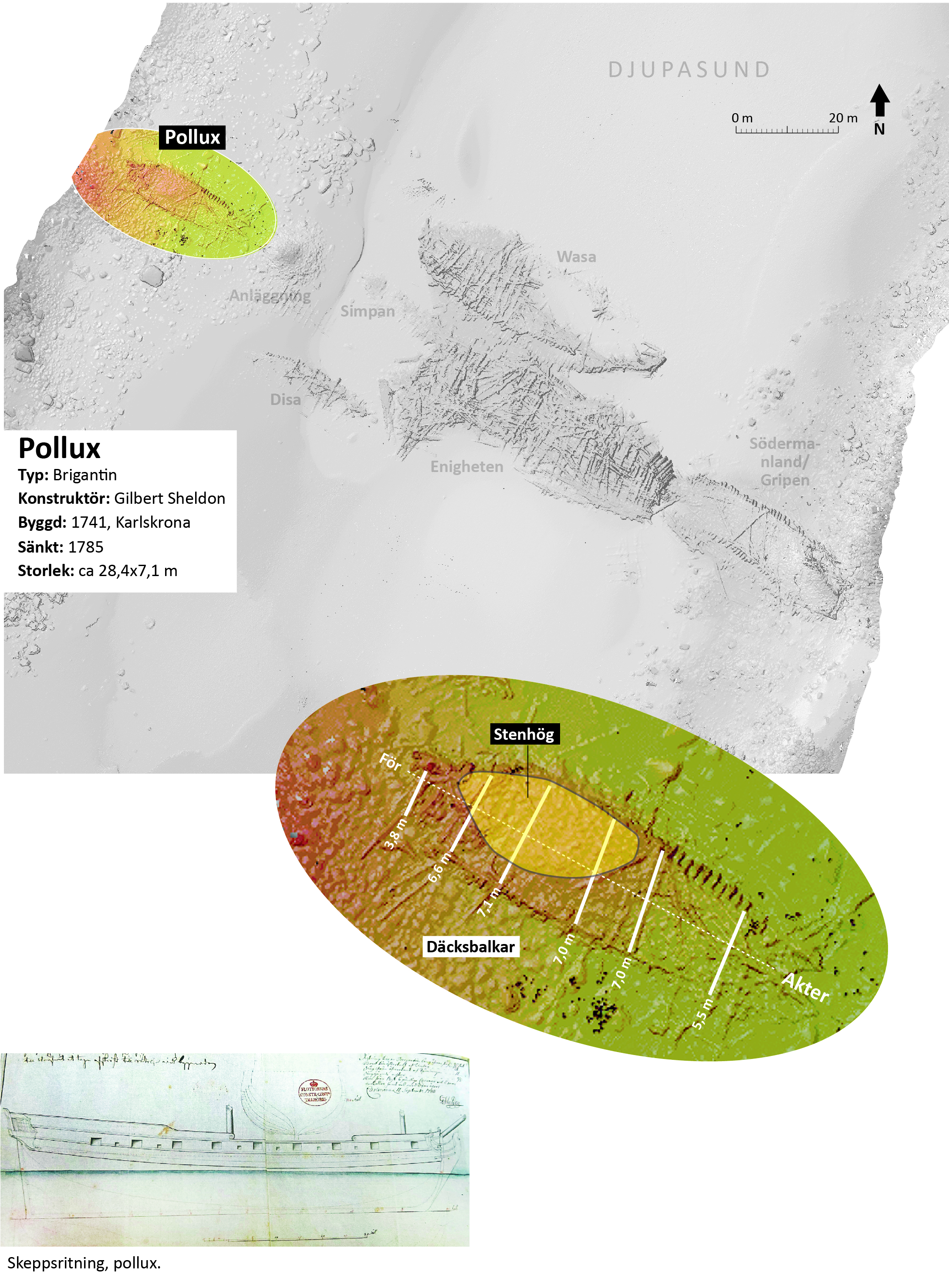 In 1741, the brigantine Pollux was launched in Karlskrona. The ship was 28.4 metres long and 7.1 metres wide. A brigantine was a two-masted vessel with a gaff-rigged main sail that also constituted the ship’s mainmast. It had square rigging on the foremast. Pollux was equipped with 18 light guns, and was sunk in Djupasund in 1785.