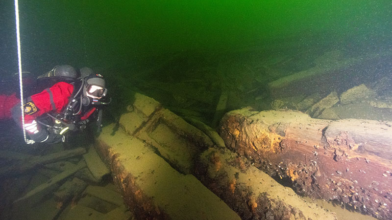 An English diving vessel loaded with diving gear, together with a group of English maritime archaeologists, met up with Swedish colleagues at Stavsnäs to establish the wreck site. Most of the shipwreck remains lie on a rocky ledge at a depth of about 30–40 metres. Below the ledge, at a depth of almost 60 metres, are fallen parts from the wreck, including a nearly intact rudder complete with tiller.