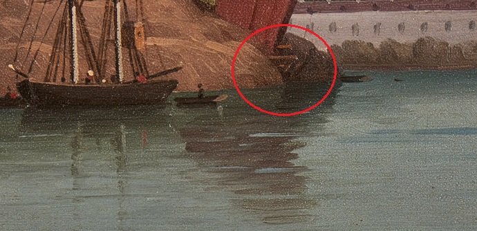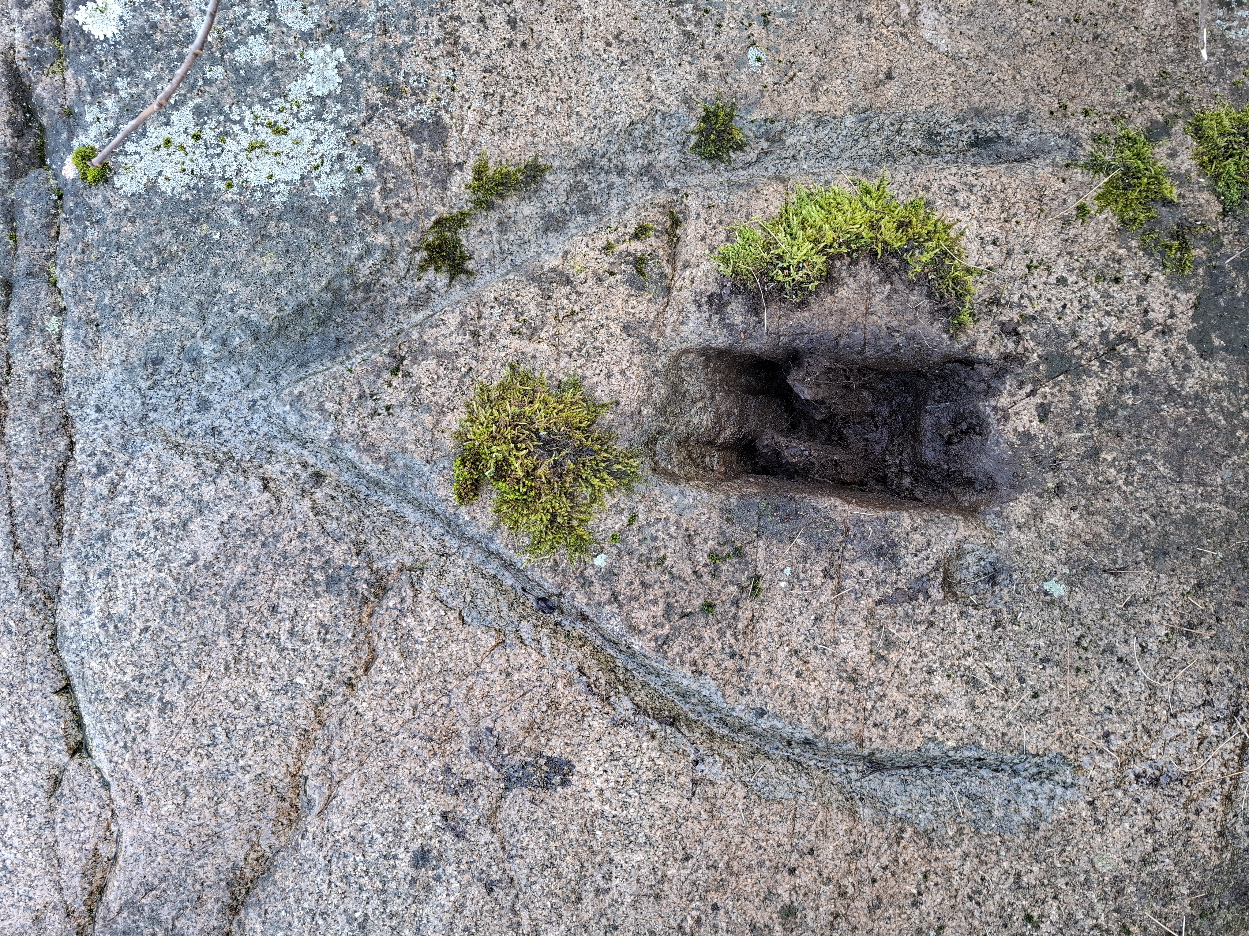Ytterligare spår av mastkranen kunde säkras närmare vattnet. Nere vid bryggan – på knappt två meter över dagens havsnivå – finns några mycket tydliga rektangulära urtag, som tillverkats på exakt samma sätt som urtaget uppe på berget: ett antal mindre borrhål har tagits upp och sedan har berget däremellan mejslats bort.