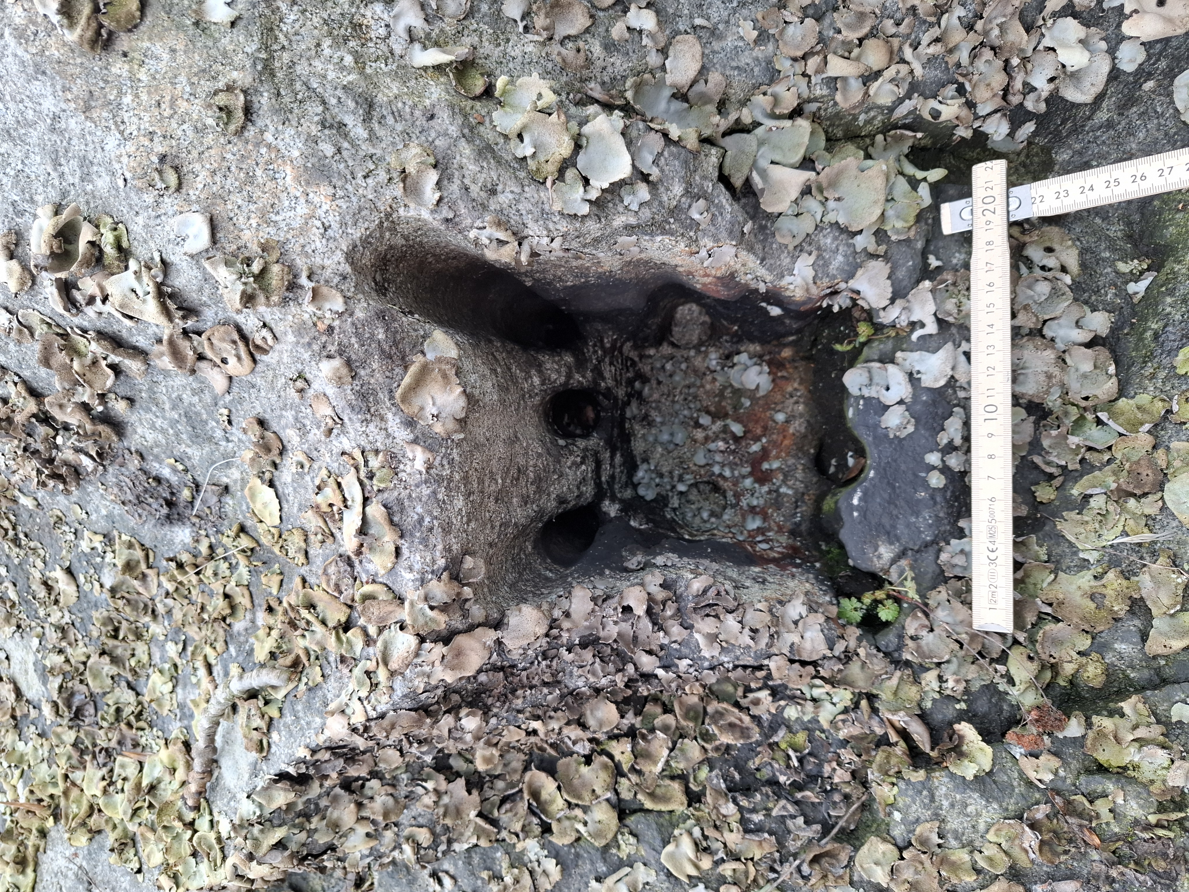 Fördjupningen har huggits fram genom en rad borrhål som sedan mejslats bort. Spåren av de mindre borrhålen syns tydligt. I botten av urtaget finns järn som fungerat för att fästa träbjälken i urtaget. I botten av urtaget finns även järndetaljer som använts för att fixera konstruktionen.