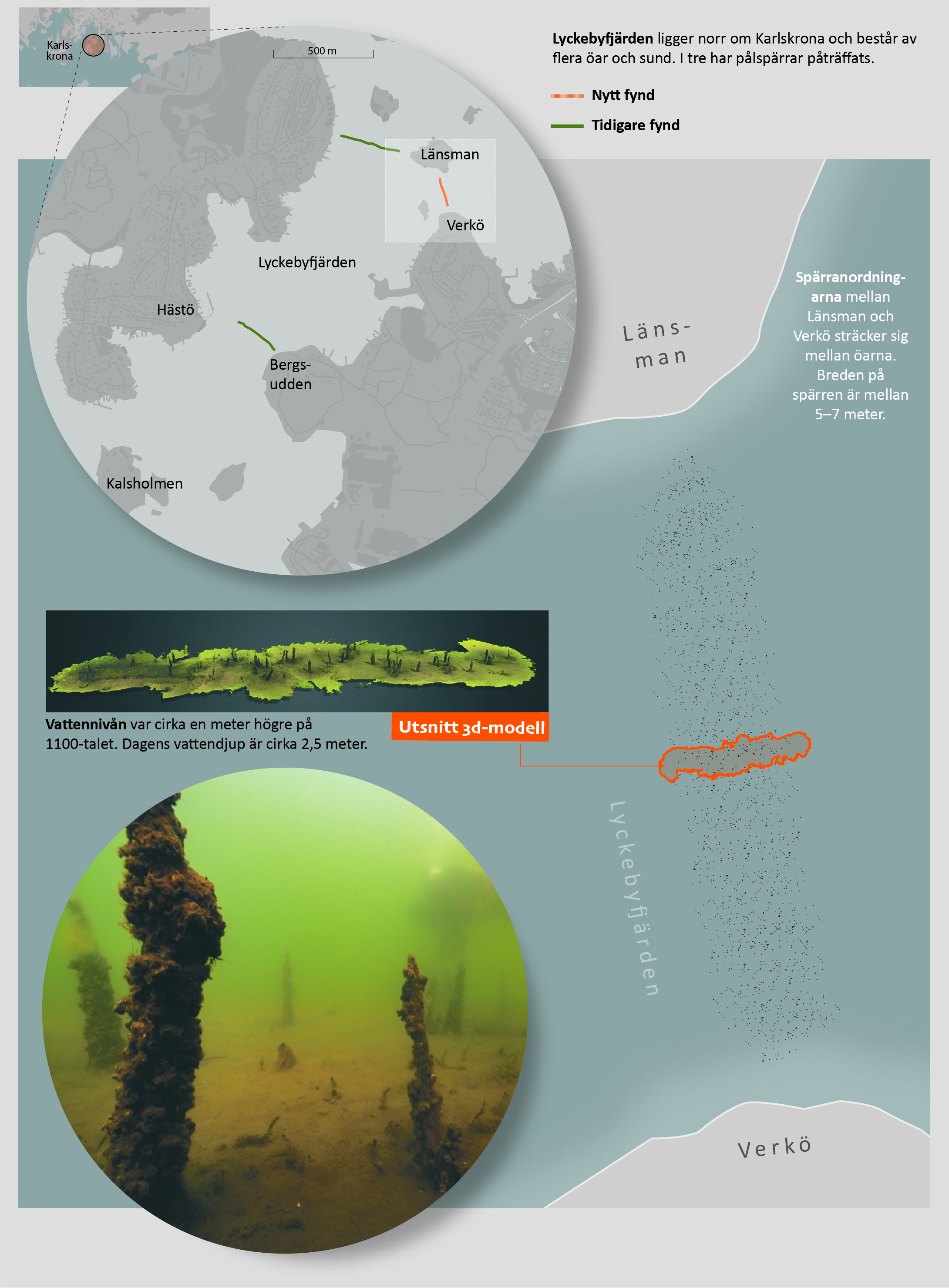 På uppdrag av Länsstyrelsen i Blekinge län undersökte Vrak – Museum of Wrecks marinarkeologer våren 2021 sex förmodade fornlämningar i Lyckebyfjärden nära Karlskrona. (Vrak är systermuseum till Marinmuseum och Vasamuseet samt en del av Statens maritima och transporthistoriska museer.) Redan 1995 hittades en spärranläggning i södra Lyckebyfjärden. Vid dykningarna förra våren kunde marinarkeologerna konstatera att det fanns spår på botten av ytterligare en spärranordning, norr om denna mellan öarna Hästö och Länsman.