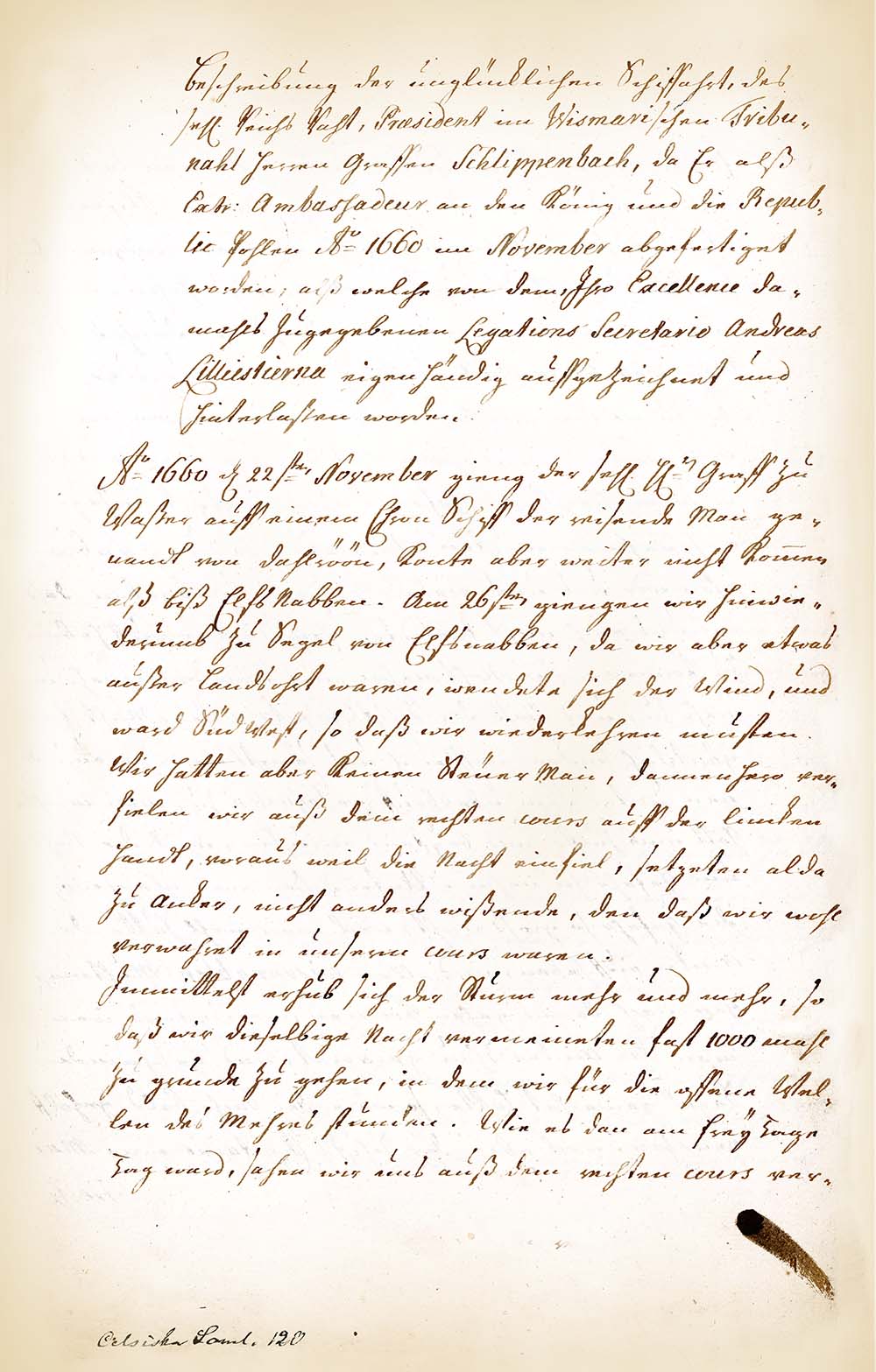 Den sista resan började i november 1660 då greven och riksrådet Christoph Carl von Schlippenbach steg ombord i Dalarö tillsammans med flera andra viktiga personer. Gruppen var en ambassad på väg till Polen för diplomatiska förhandlingar. Med sig hade de gåvor av silver, jaktvapen och annan dyrbar utrustning. Sådana gåvor var en viktig del av förhandlingskulturen. De visade status och makt. Källorna berättar också att Schlippenbach hade med sig sin personliga reskassa och en silverservis i en röd kista. Dessutom nämns att det fanns juveler ombord som tillhörde staten.