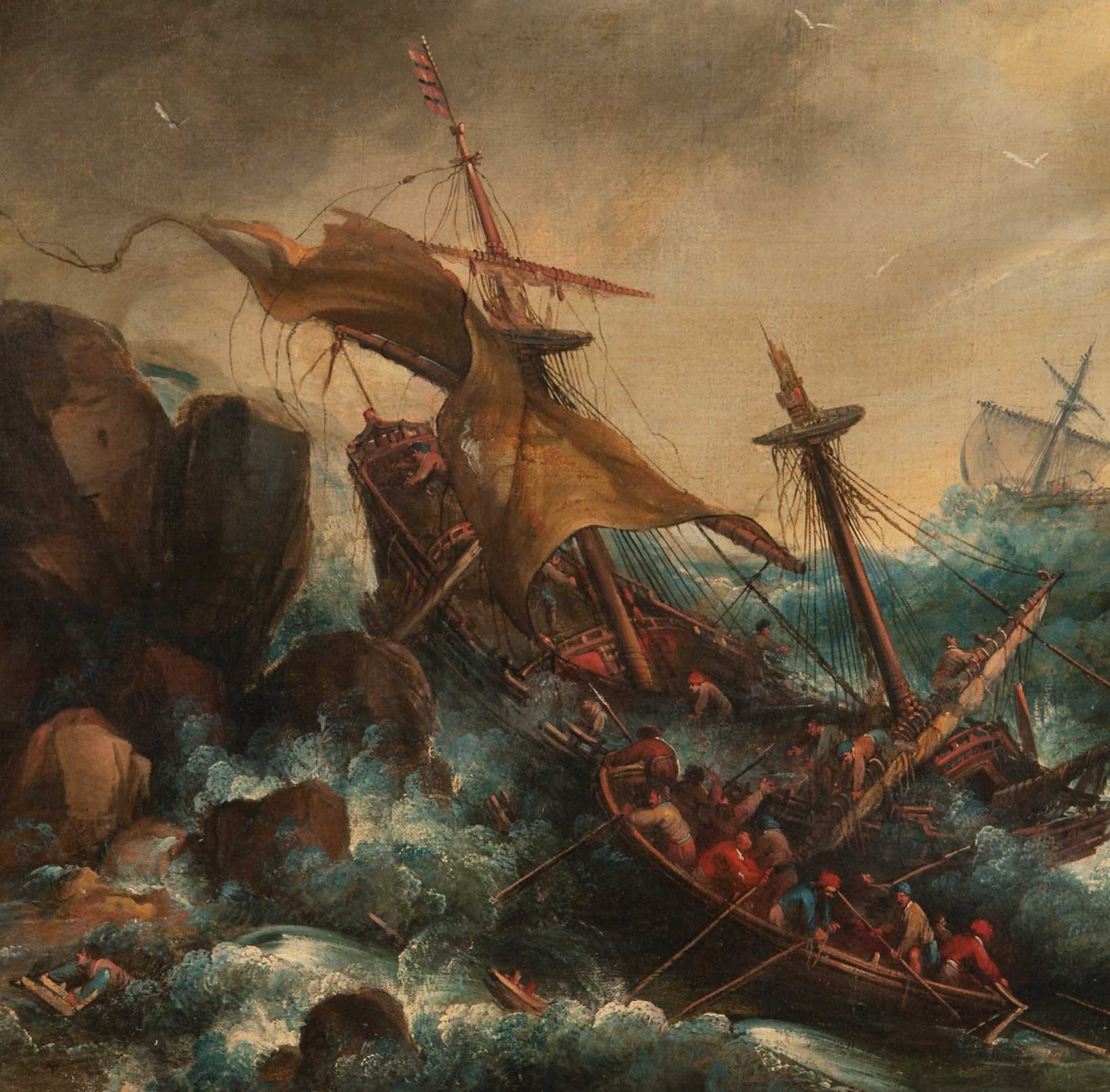 I paniken försöker några ombord rädda sig i en mindre båt. Men båten kommer iväg utan åror. Den går inte att styra och kantrar i vågorna. Nästan alla i båten drunknar. Samtidigt fortsätter skeppet att driva. Besättningen pumpar, svär, kämpar och försöker få ner den stora skeppsbåten i vattnet. Men det hjälper inte. Skeppet slår mot klipporna, tar in vatten och sjunker.