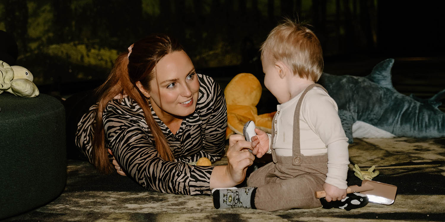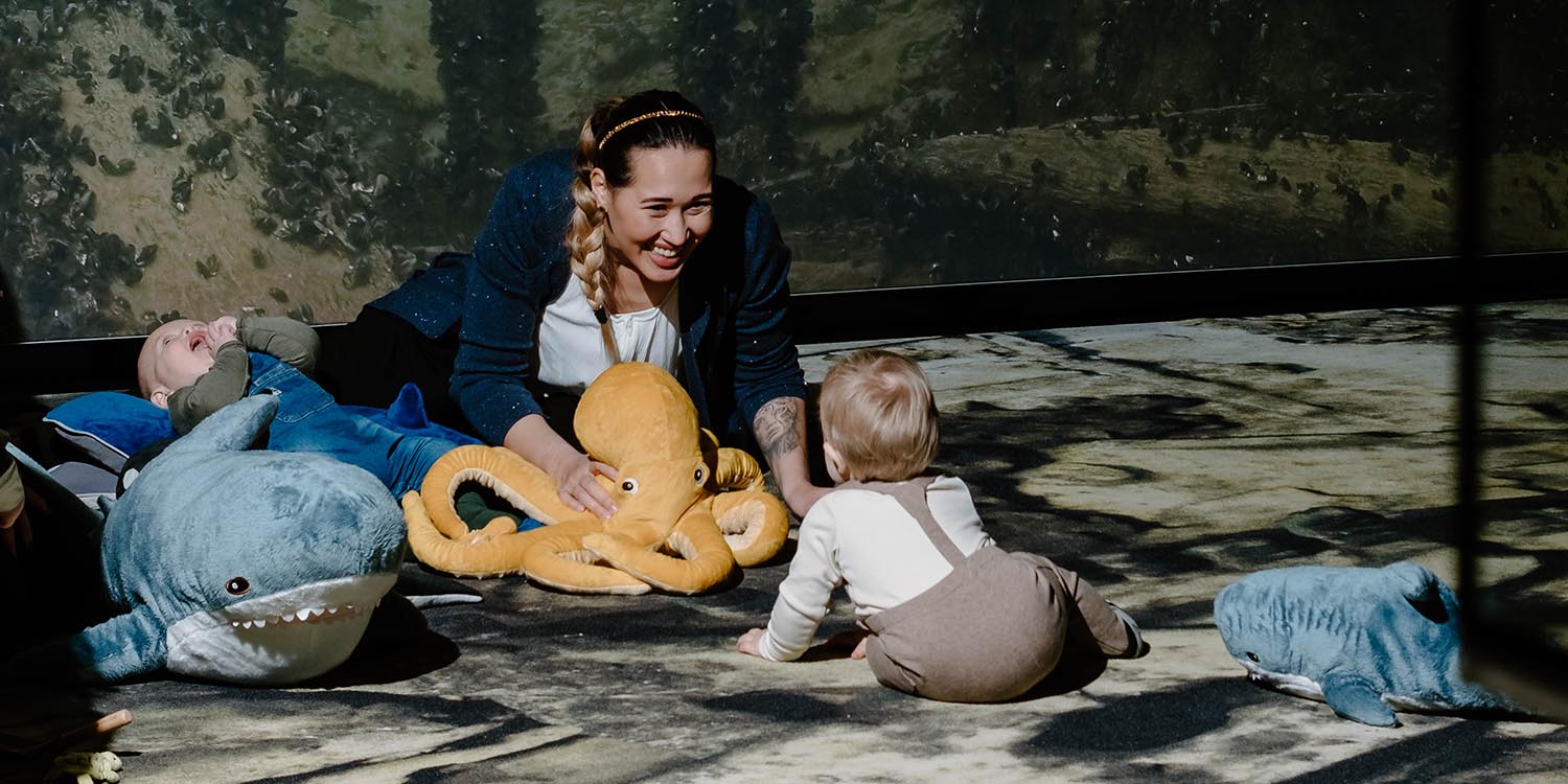 I en av museets utställningar skapas en undervattensvärld med gosdjur på den mjuka mattan där bebisar kan krypa runt och upptäcka rummet mellan klockan 10 och 12.