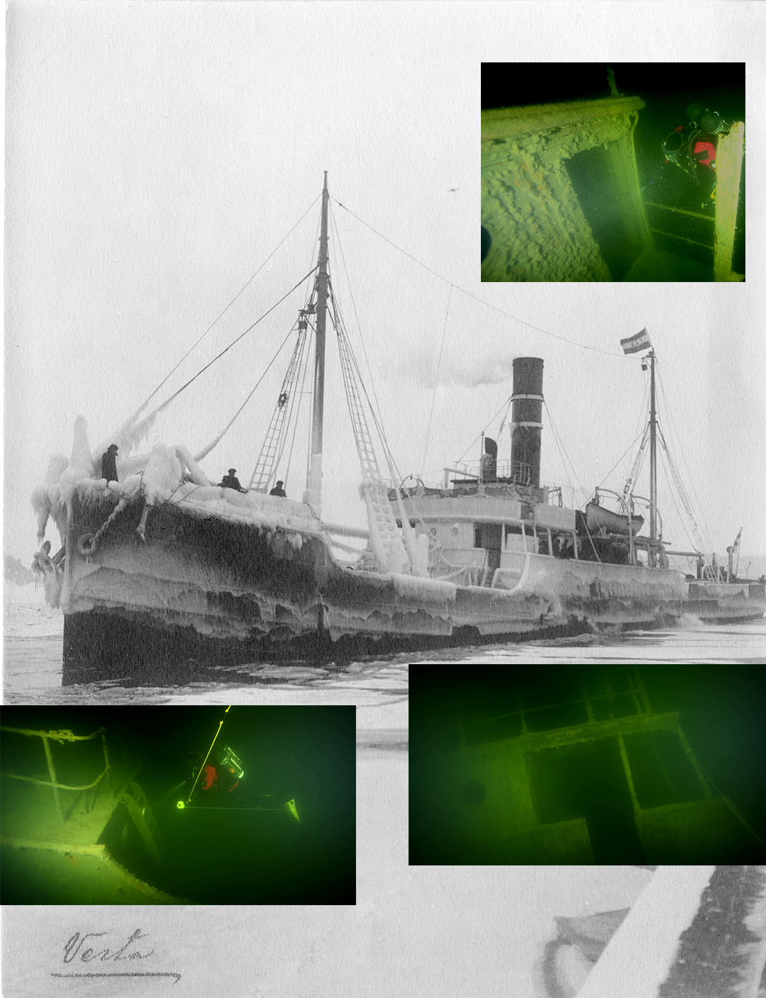 Lastångfartyget Vesta, okänt årtal, fotograf och ort. Fotografiet illustrerar hur ett ångfartyg kunde se ut när det vintertid var nedisat. Museiverket Finland. CC BY 4.0. Montage med SMTM:s dykbilder från 2023.