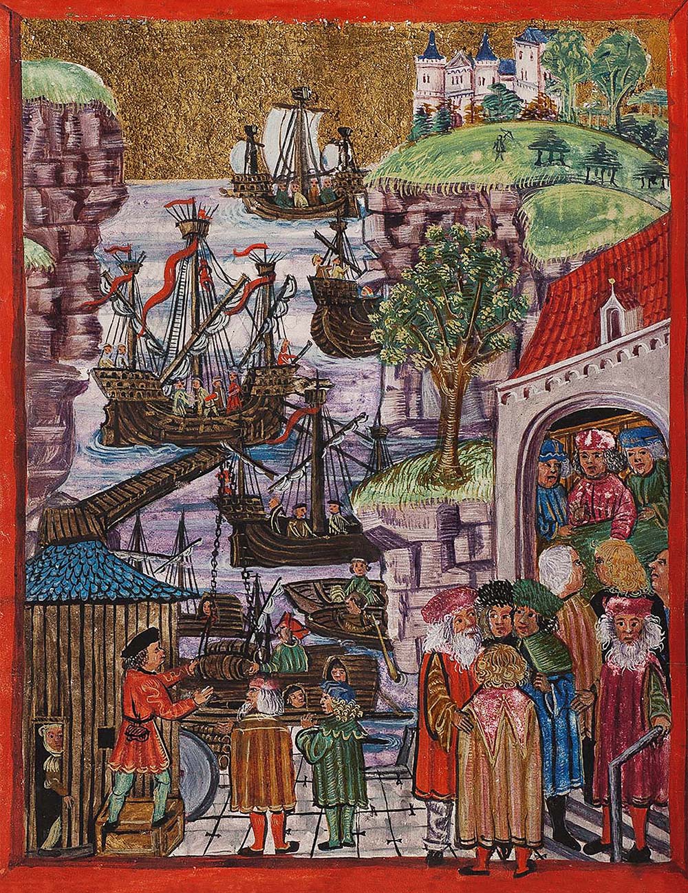 Omslaget på en av Hansans lagböcker, visar hur handelsmän från Hansastäderna Hamburg och Lübeck 1247 förenas för att gemensamt kontrollera handeln över Östersjön. I bakgrunden syns handelsskepp från den tiden. Foto/Källa: Staatsarchiv Hamburg.