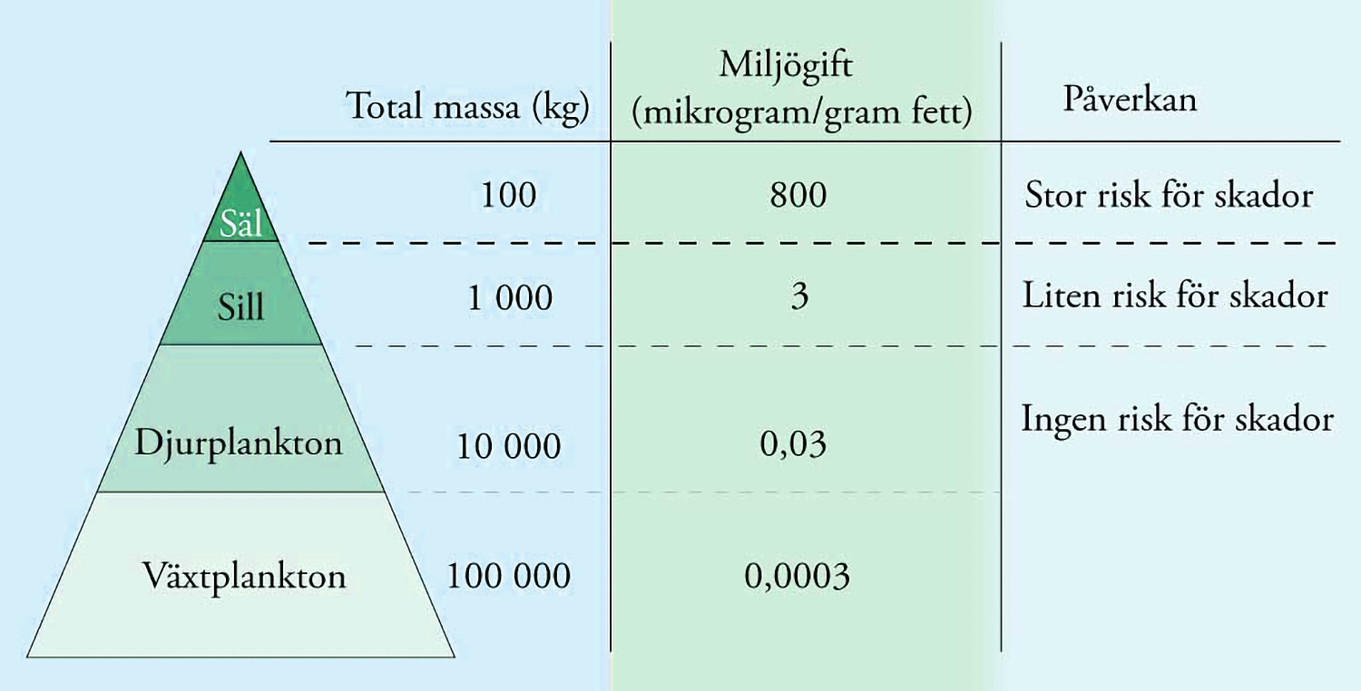 Mängden miljögift/kilo kroppsvikt ökar desto högre upp man kommer i näringspyramiden. Det innebär att de som befinner sig högst i näringspyramiden så som sälar, tumlare och vi människor drabbas värst. Källa: Skolvision.se